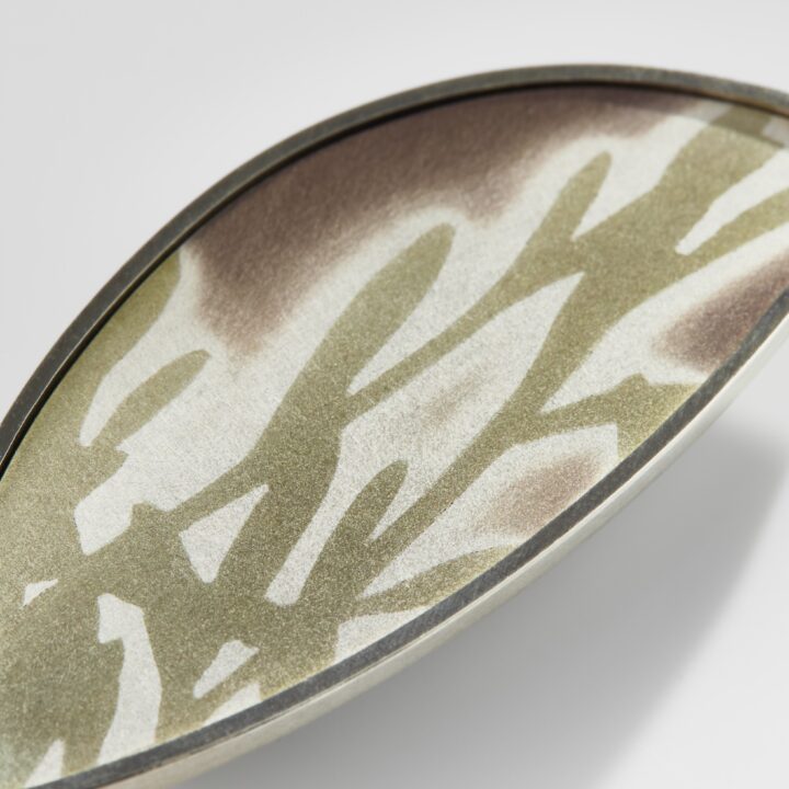 サム・クレイマー、《ダンサー》、ペンダント、1946年、素材:銀、個人蔵:ジョン(チコ)・クレイマーおよびキャロル・ジェーン・クレイマー、撮影:ジョー・ゴールド(Joe Gold)|このテクスチャは、バーナーを二刀流で使って慎重にコントロールしながら作られたもので、クレイマーの作品に度々登場しています。