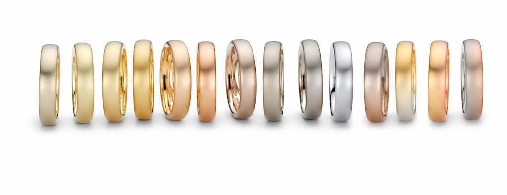 実は私のマリッジリングはこの《NIESSING(ニーシング)》のものです。当時は特にそのような知識も無く、デザインで選びました。確かにもう20年近く身につけていますが、歪みは全くありません。因みにデザインで選んだとお話ししましたが、《NIESSING(ニーシング)》のジュエリーはドイツの造形学校、「バウハウス」の流れを汲んでいる為か無駄の無いシンプルな造形です。ですが、そこにはシンプルという言葉では表現しきれないこだわりが随所に見られます。形状・幅・カラー・仕上げなど、細かなカスタムも可能で、特にカラーバリエーションは14種類と豊富!