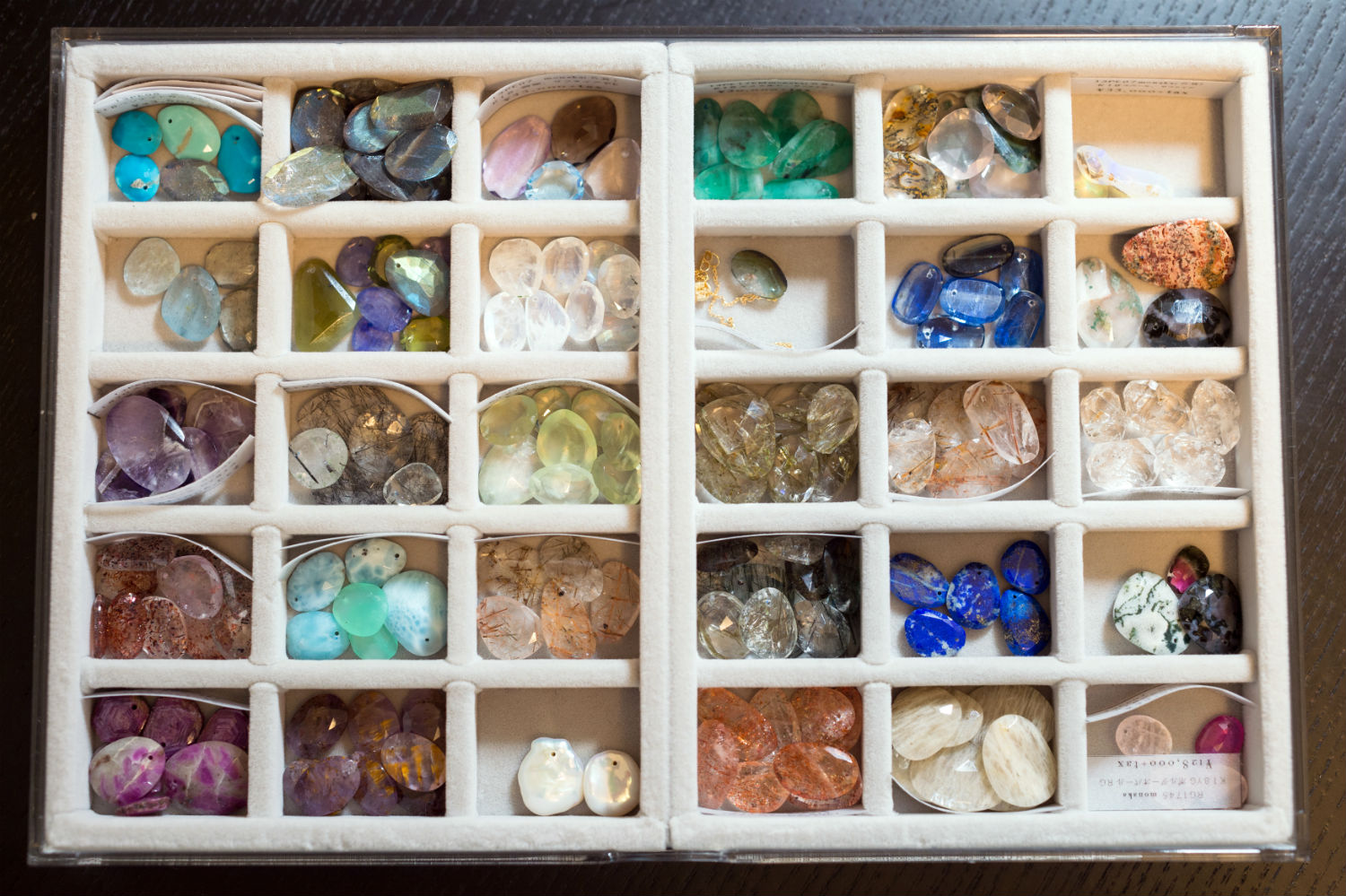 寳神さんが年に数回海外で求める石の数々。ハイジュエリーの会社勤務経験を活かしつつ、色や形が面白い石をセレクトしている。石の個性をどうやって引き出し、どんなジュエリーにするのか考えるのが面白いのだという。