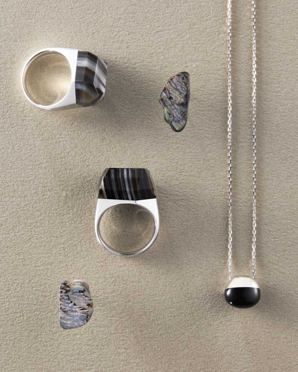 CULET伊勢丹新宿店で今回初めてのお披露目となるのは、ブラックバンデッドアゲートをあしらった新作ロックリング6点。厳選された原石のみで制作しているため、次回の入荷は未定と言われる希少なピースです。