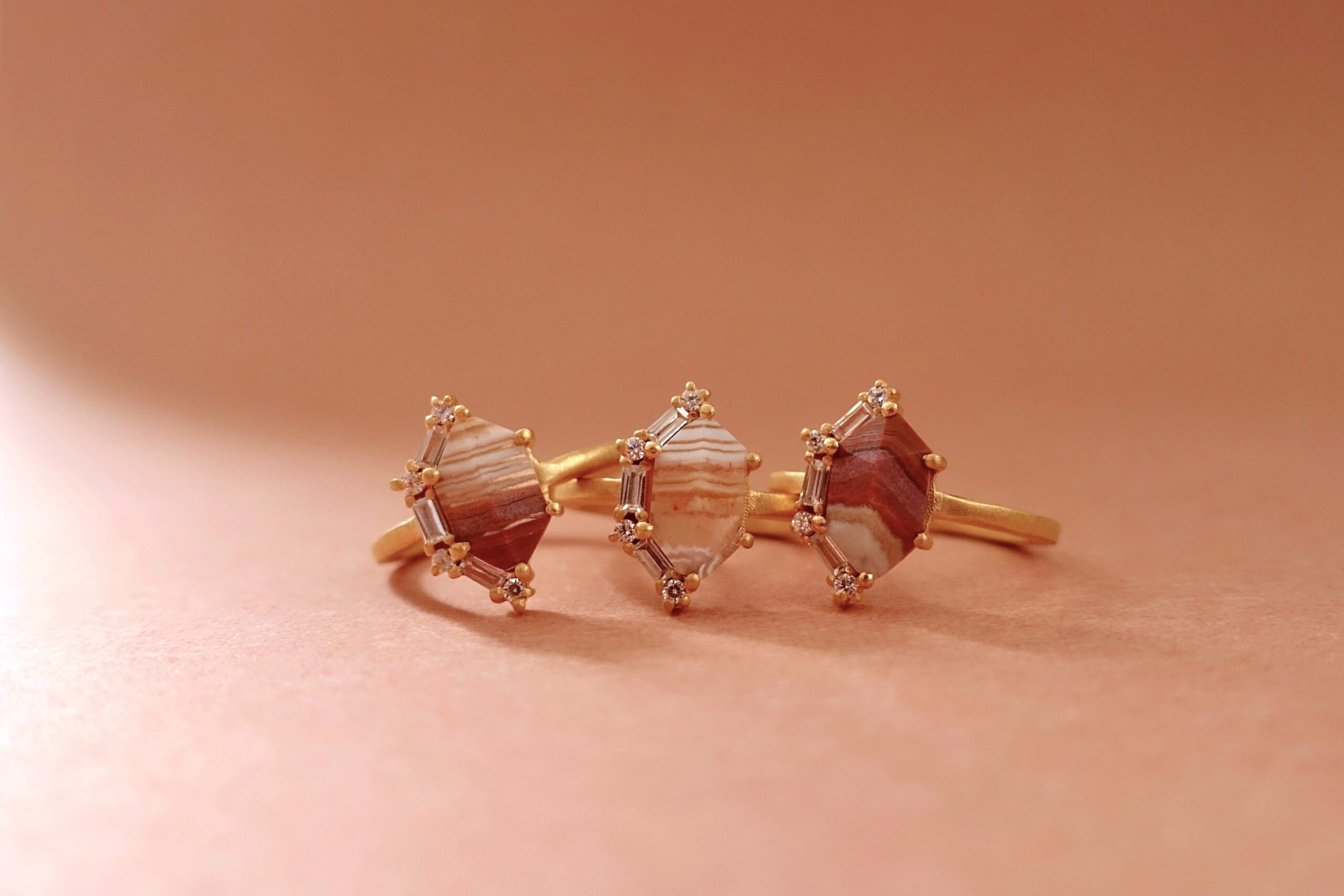 ブランド設立10周年という節目となる今年は、天然石を原石から買い付けカットするところからジュエリーをデザインするという、新たなクリエーションにチャレンジし、新作BANDEDシリーズが秋より販売されます。希少なDryhead agateや世界一美しいと賞賛されているメキシコはチワワ州で算出されるLaguna agateなどを買い付け、その石の一番美しい姿をリングやネックレスとして身につけていただけるようデザイン。何百年もの地球の歴史が詰まった縞模様の神秘や、一つ一つ違う表情を楽しめるジュエリーが並びます。