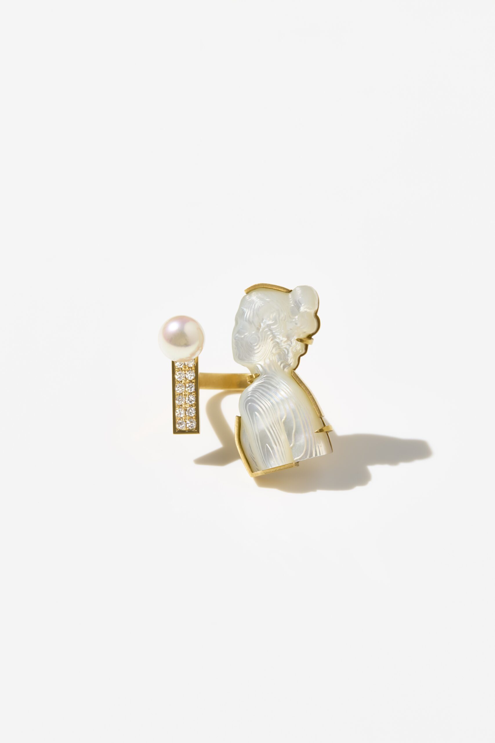 新作 ”Permanent_Cameo” シリーズでは独自の養殖技術と宝石切削技術を組み合わせ、ヌーマイトで作られたカメオの上にぴったりと真珠層が被っている、柔らかな陰影が印象的な今までに見たことのないカメオジュエリーが出来上がりました。