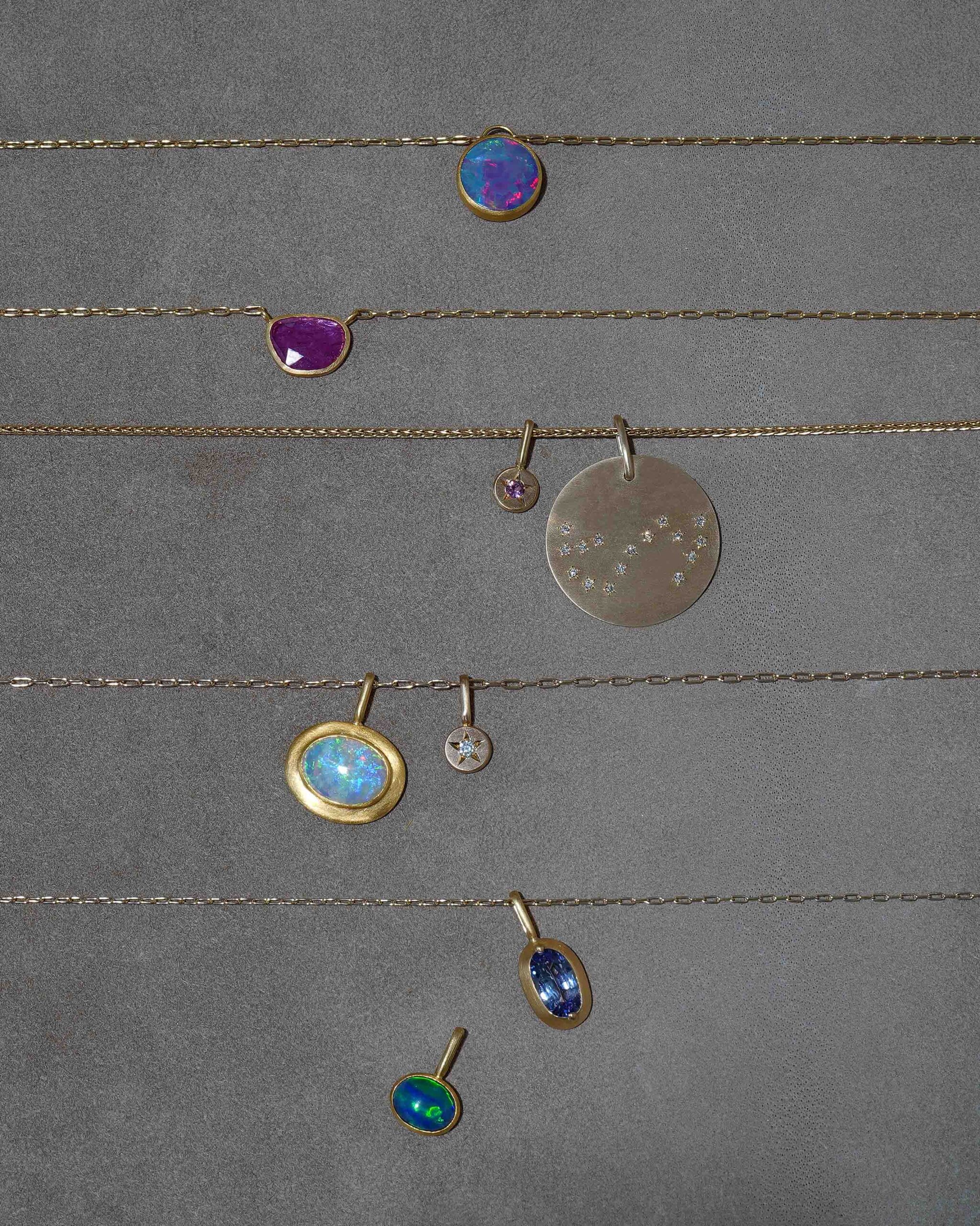 しなやかな質感を湛えたゴールドに、色石やダイヤモンドをあしらったtalkativeのネックレス。シンプルでありながらも、ひとつひとつに確かな存在感が宿り、身につける人の個性を引き立ててくれるジュエリーです。