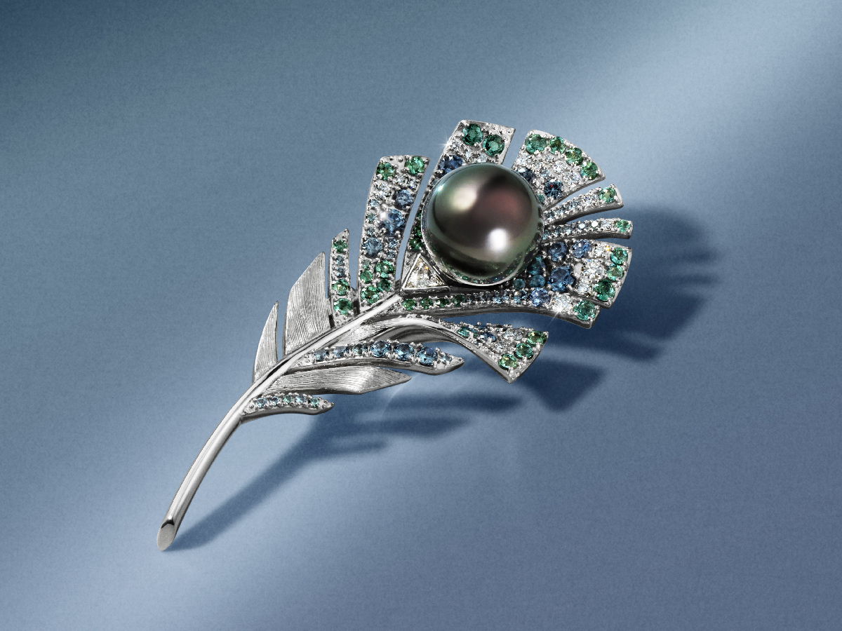 たとえば、「Chromaplumée principal(クロマプリュメ)」は、黒蝶真珠とアレキサンドライトを組み合わせ、孔雀の羽を思わせる色彩を表現。繊細な職人技も巧みに施し、高貴で優雅、そして情熱的といった多面的な魅力をもつ「六条御息所」をイメージされています。