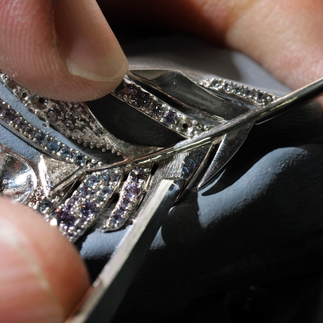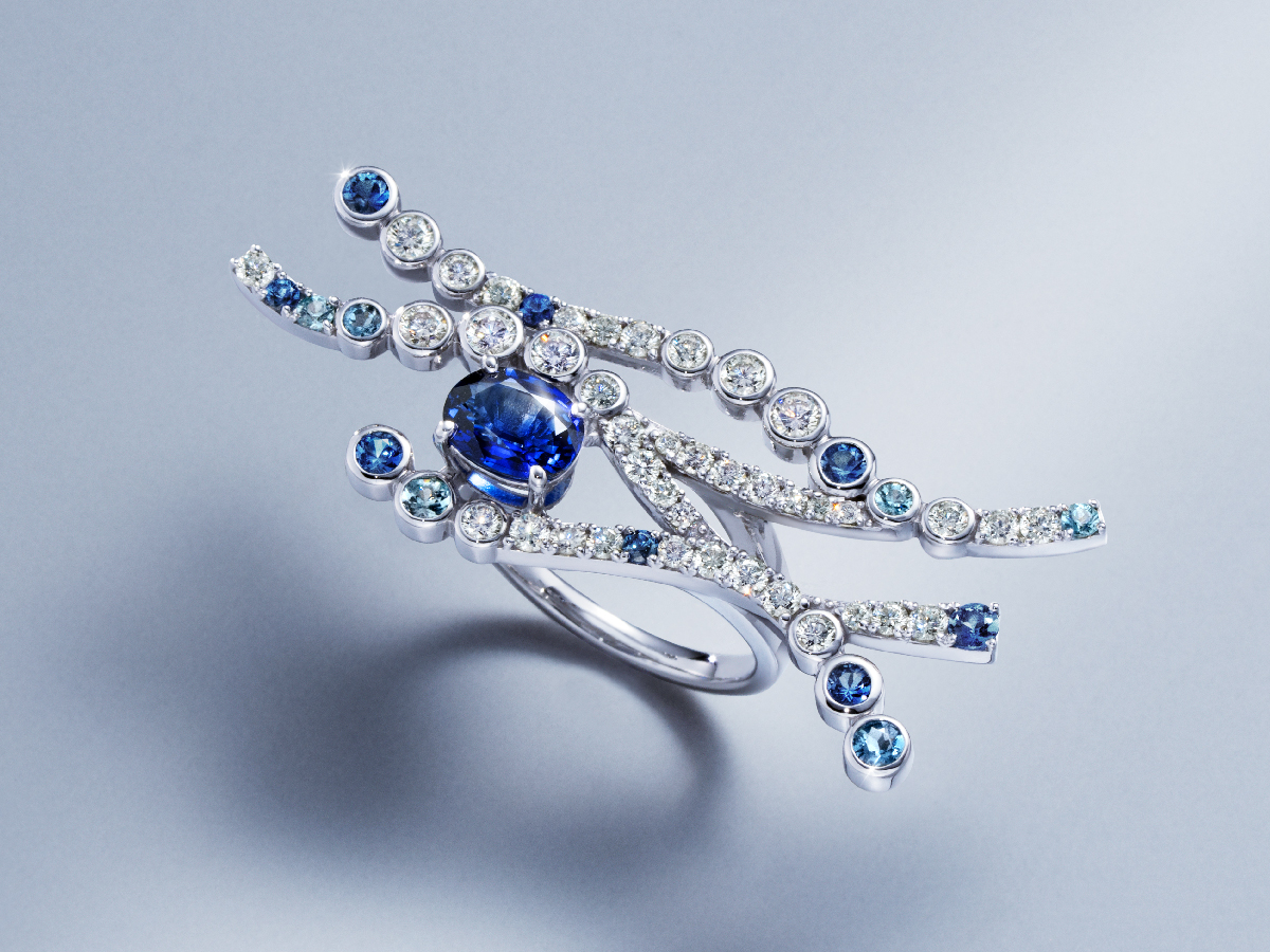 また、明石の君をイメージした「Séravelle principal(セラヴェル)」は、ブルーサファイアと水紋のモチーフで静かな気品を表現。古典で見られる水紋表現・流水紋を参照しながら、主体石にはブルーサファイアを用い、石留め技法や高低差など繊細なつくりにこだわっています。