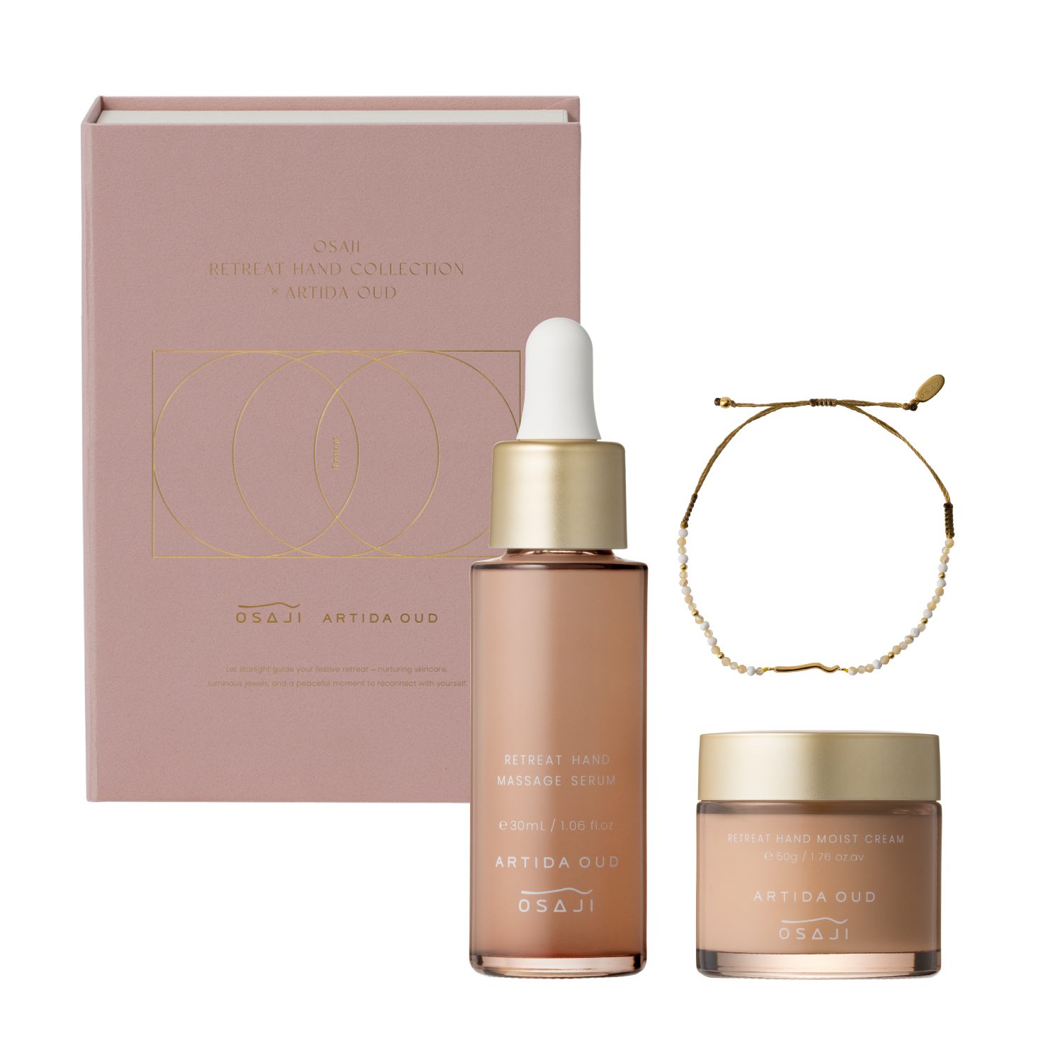 限定デザインのパッケージに包まれた特別なセットは、《OSAJI(オサジ)》で人気の「リトリート ハンド マッサージ セラム」と「リトリート ハンド モイスト クリーム」に、《ARTIDA OUD(アルティーダ ウード)》の天然石ブレスレットを組み合わせた特別仕様。天然石の輝きとオリエンタルな香り、そして手肌を慈しむケアを通じて、自分自身を優しく癒すようなひとときを届けます。