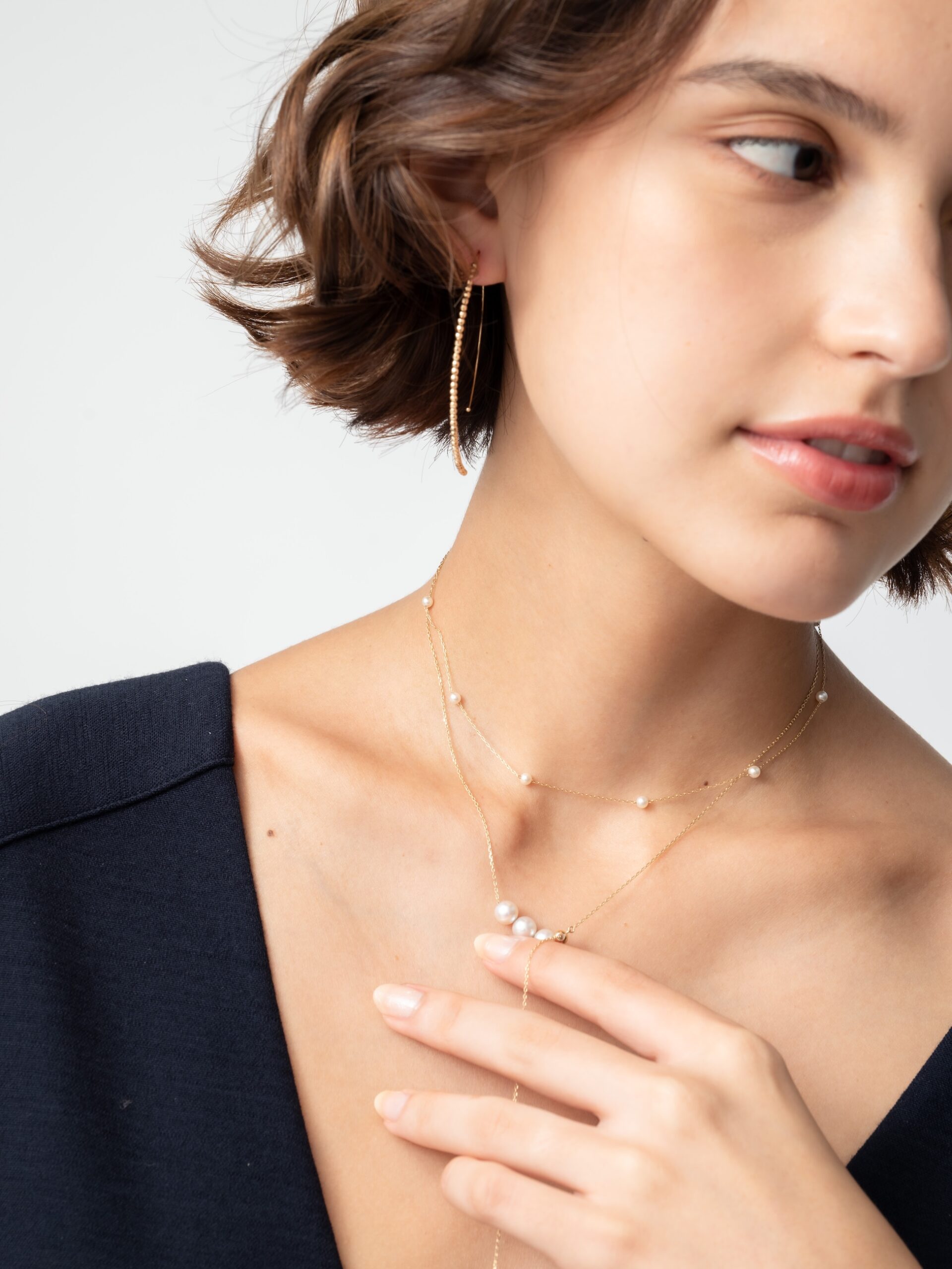 1996年にニューヨークで誕生した《MIZUKI(ミズキ)》は、デザイナーのミズキ・ゴルツが夫のアランとともに立ち上げたブランド。パールを原点に、流れるようなゴールドラインや繊細なフォルムで、エフォートレスかつタイムレスな美しさを追求し、身につける人に自信としなやかさを与えるジュエリーとして、世界中の女性たちに愛され続けています。