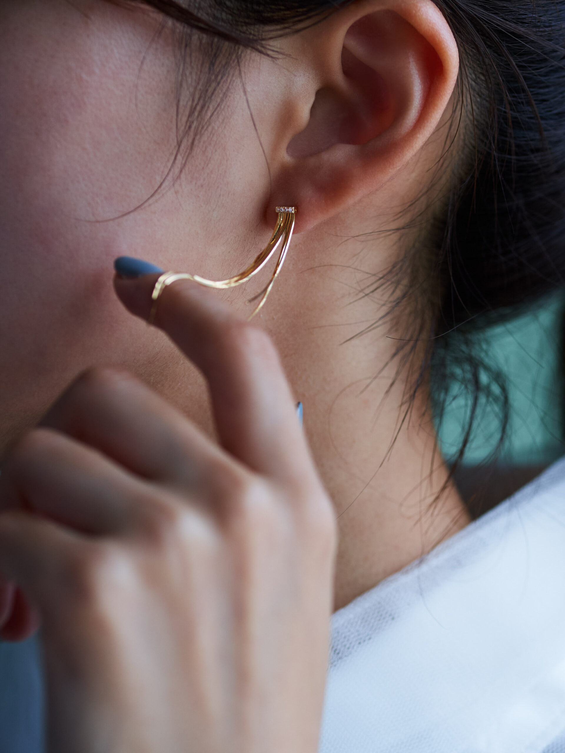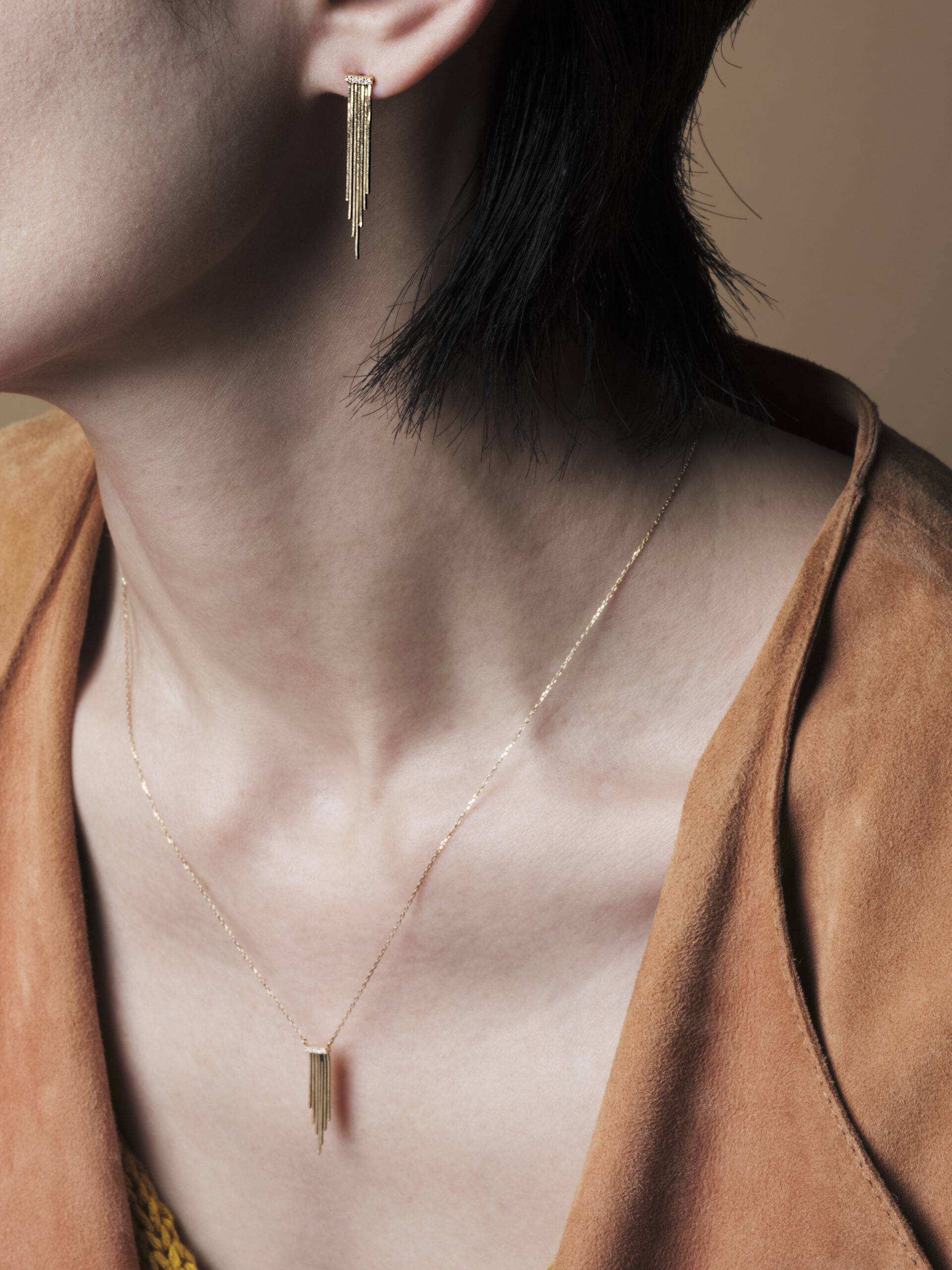 コレクション「FRINGE」は、talkative らしいグラフィカルな線の美しさと、繊細に揺れる立体構造が魅力のシリーズ。一本一本の金線を丁寧に曲げて組み上げる構造は、軽やかでありながら存在感があり、シンプルな装いにも凛としたモード感を添えてくれます。