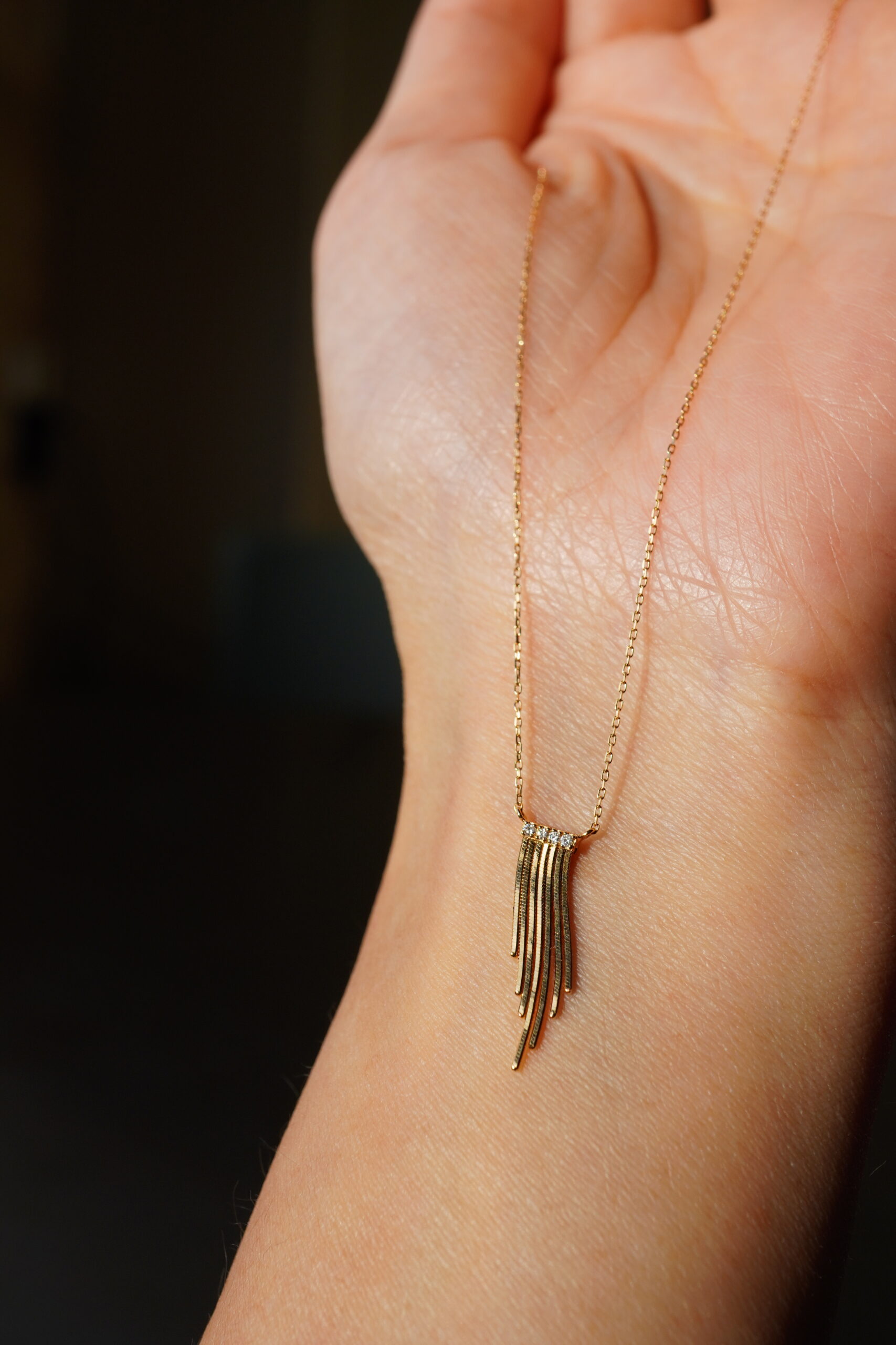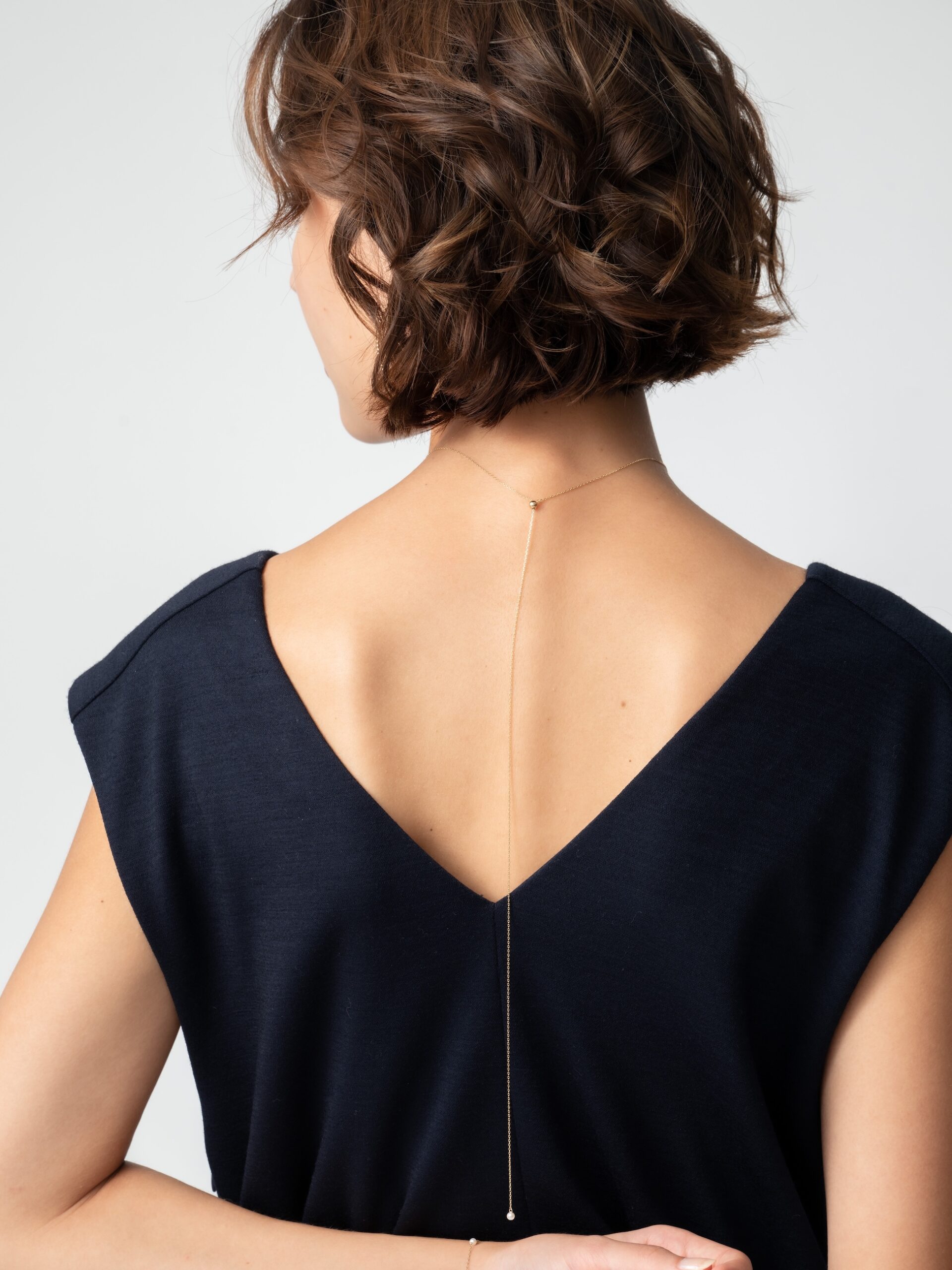 シーンを限定しないのは、“揺れるように長さを変えられる”ラリアットならではの自由さゆえ。フォルムを変えるたびに表情が変わり、身につける人のムードや時間とともに、自然に“自分のジュエリー”へと育っていく感覚があります。首元にすっと沿わせても、長く垂らしてもしなやかに決まり、ドレスアップにも日常のTシャツにも寄り添う懐の深さが魅力です。