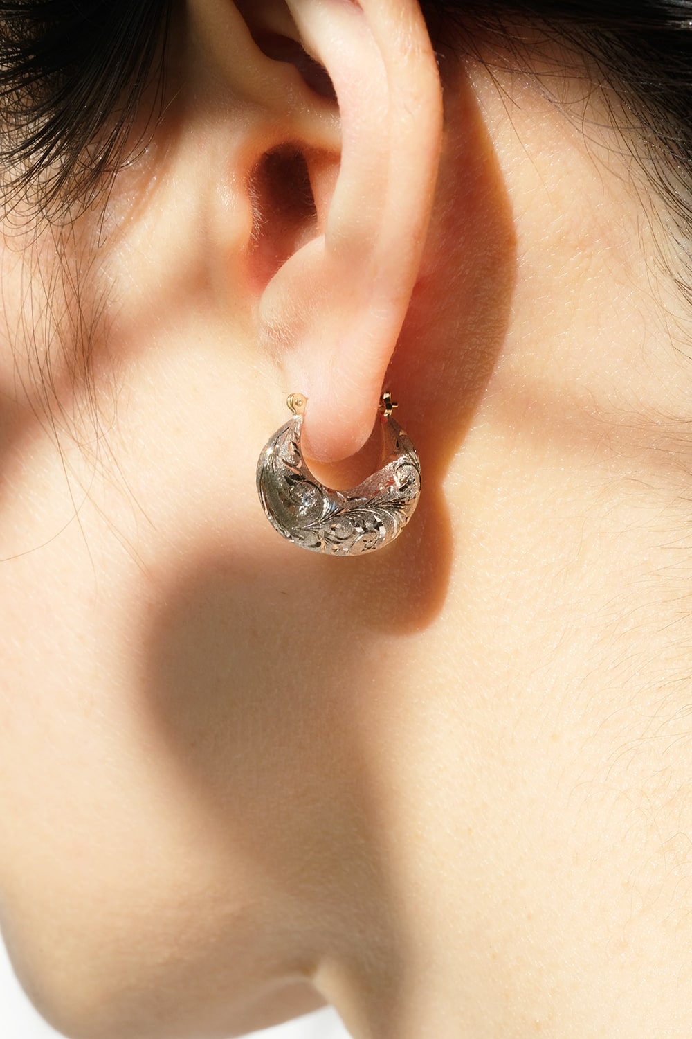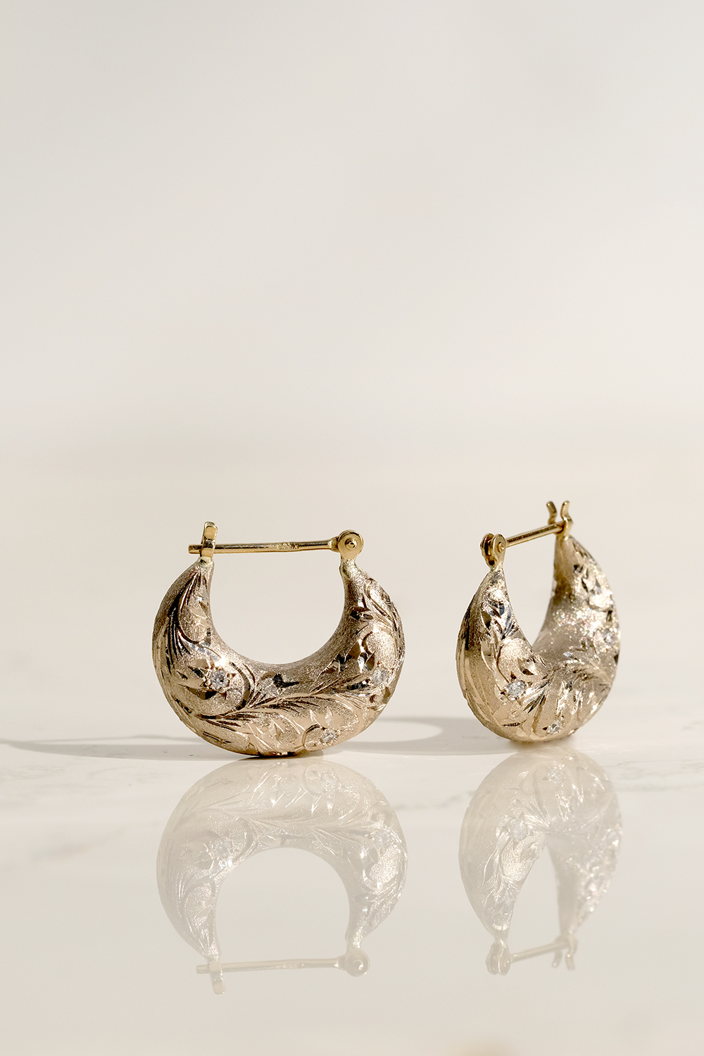 「Arabesque Diamond White Gold Earrings」は、その象徴ともいえるシグネチャーピース。古来より“繁栄”や“豊穣”を意味してきた唐草模様を、職人の手で繊細に和彫りし、ホワイトゴールドの弧を描くフォルムにそっと重ねています。