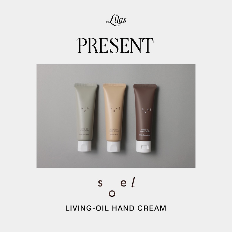 2025年12月11日(木)より、LilasまたはSAMH by LILASの商品を49500円(税込)以上購入した方には、ホリスティックスキンケアブランド《soel(ソエル)》の「リビングオイル ハンドクリーム」がプレゼントされます。