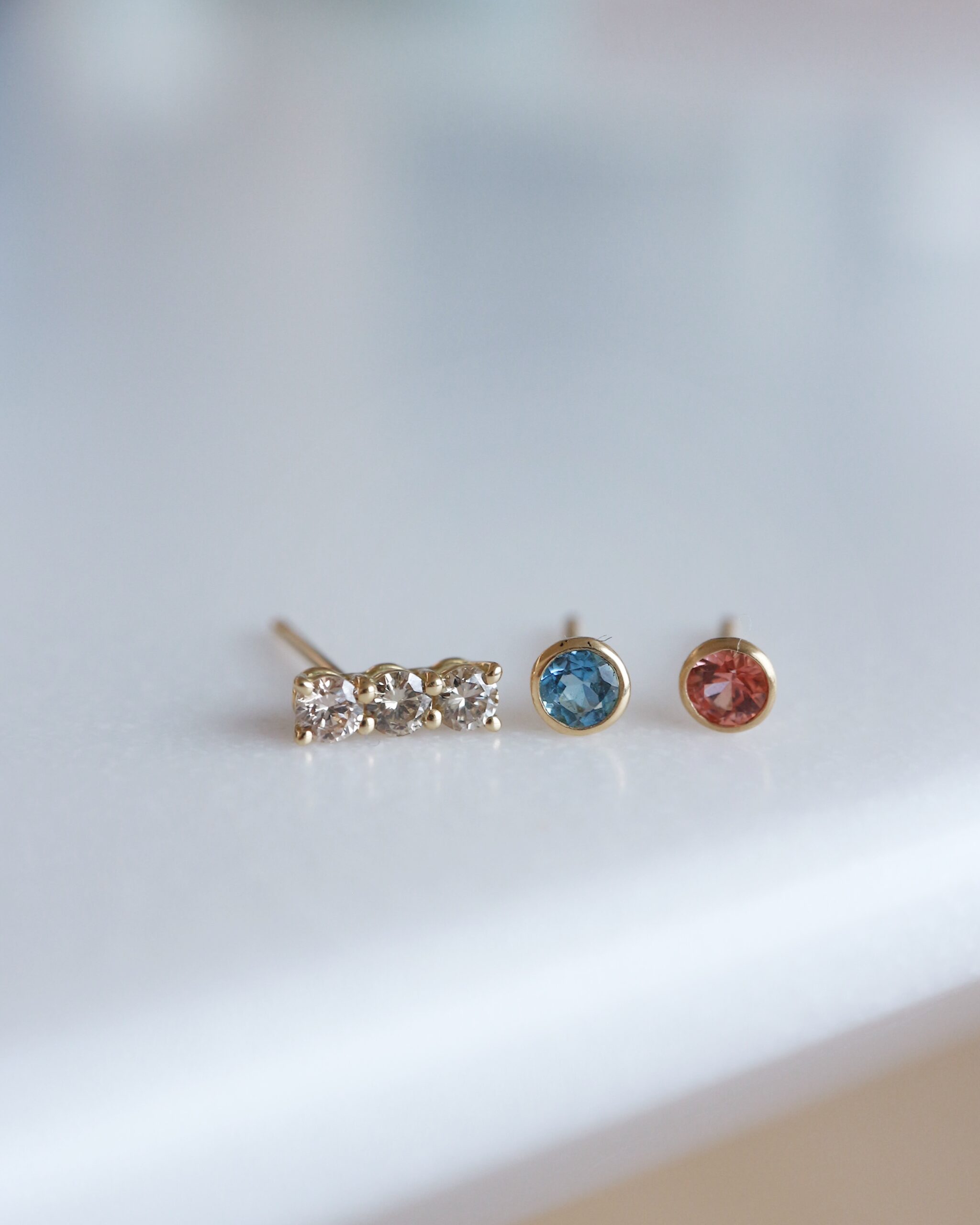 日常使いしやすいシンプルなデザインを軸に、オレンジサファイア、サンタマリアアクアマリン、ブラウンダイヤモンドなど、デザイナーが厳選した天然石を主役に据えたスタッドピアス。
