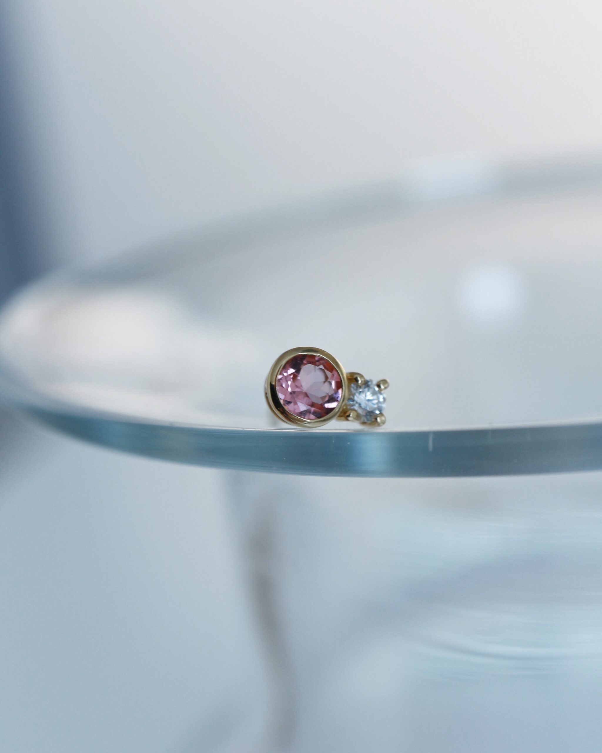 ミニマルなスタッドピアスというフォーマットの中に、《TOMOKO FURUSAWA JEWELRY(トモコ フルサワ ジュエリー)》らしい色合わせを取り入れた二石タイプも展開。一見ベーシックでありながら、配色やバランスによってさりげかな個性を感じさせる仕上がりです。