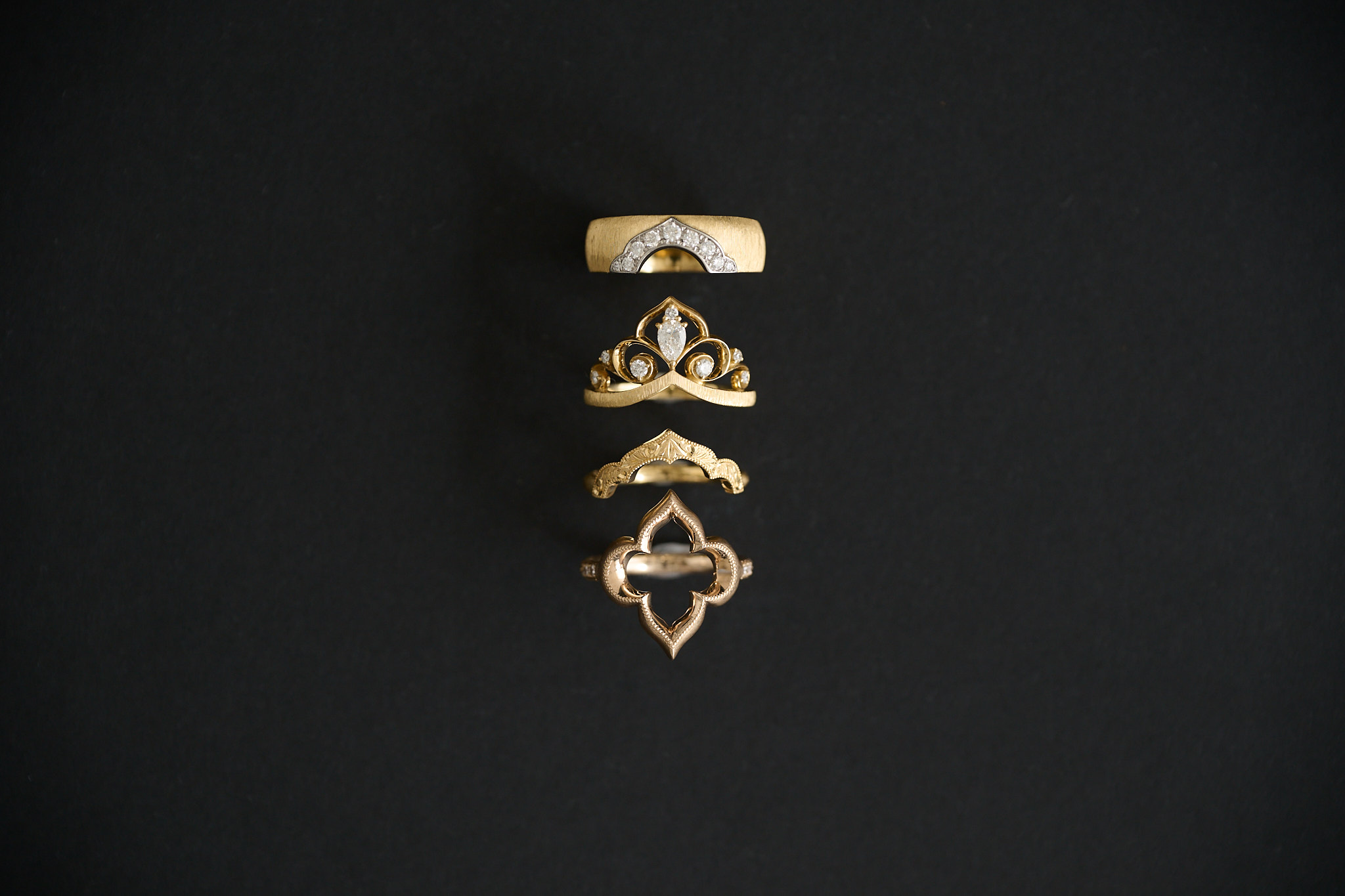 2020年にスタートした東京発ジュエリーブランド《Kagann(カガン)》。古今東西の歴史や文化、神話、建築、文字装飾、植物文様などを手がかりに、シルクロードを巡り紡がれてきた美意識をインスピレーション源とし、日本の高度な職人技術によって、気品あるジュエリーへと昇華しています。