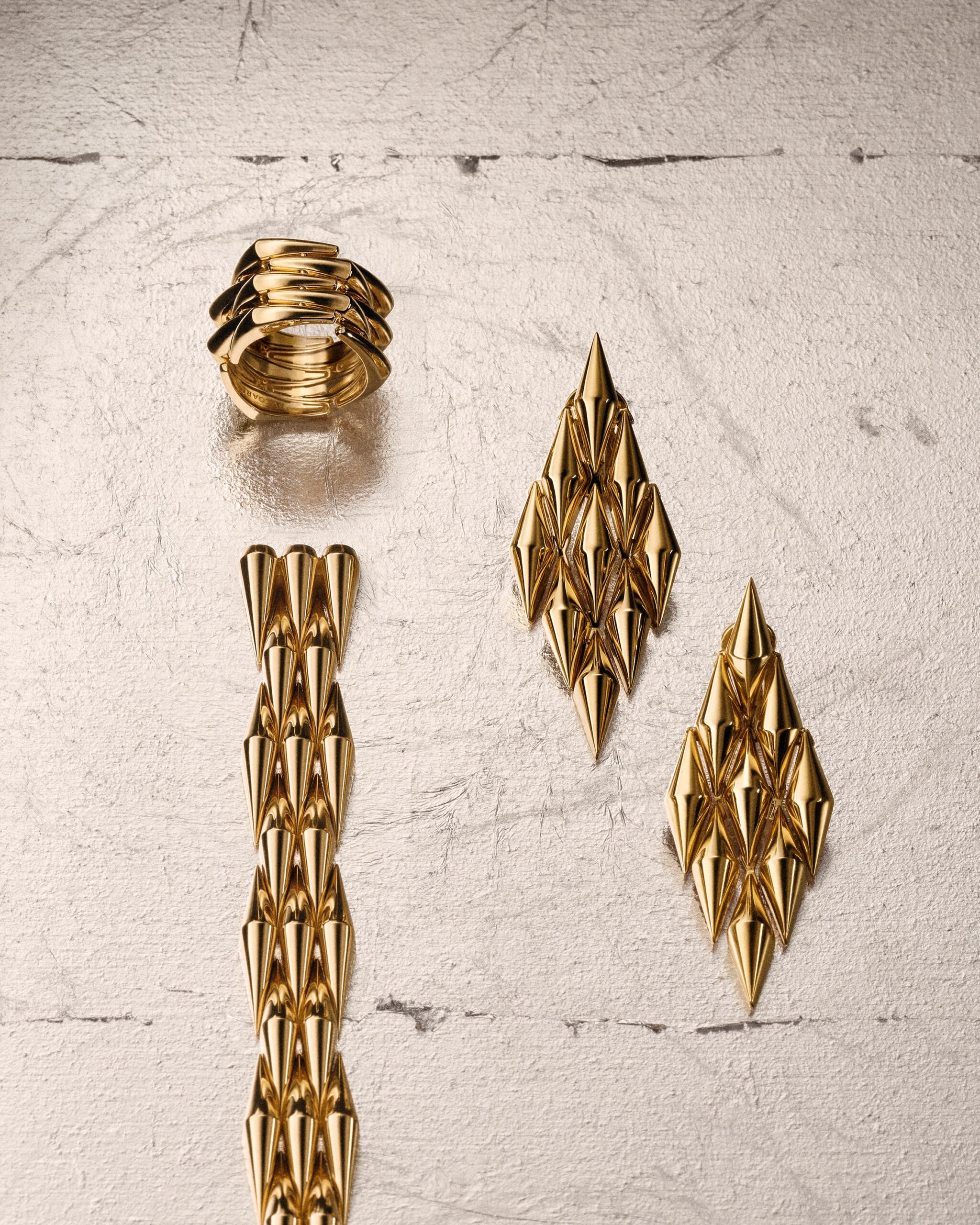 ネックレスは身体の動きに寄り添う流動的なラインを描き、リングはモジュールを再解釈した折りたたみ可能な5連構造で、クラシックとアヴァンギャルドが共存する表情を見せます。
