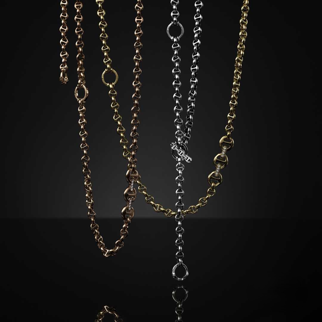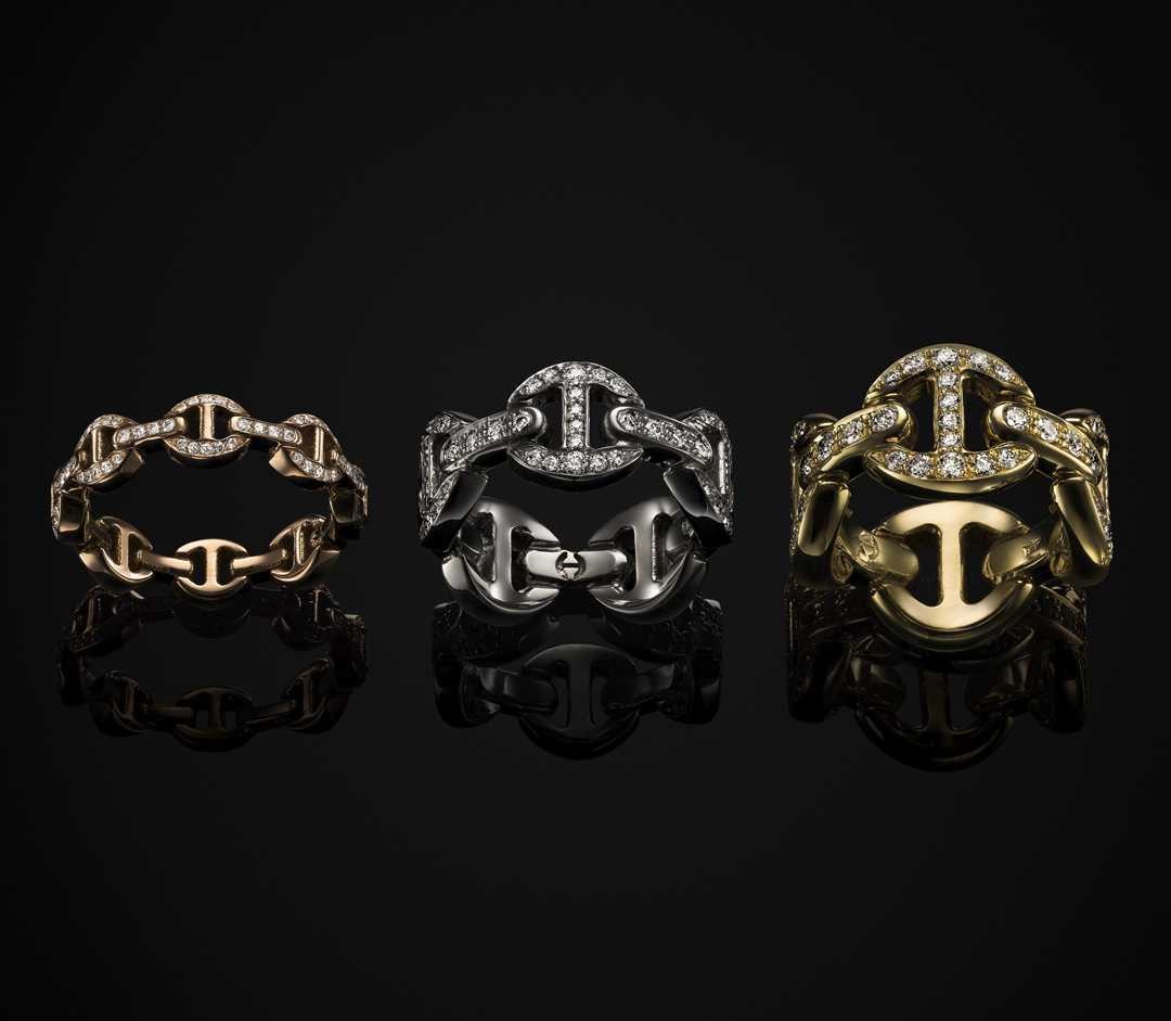 HOORSENBUHSを象徴するモチーフといえば、「トライ・リンク」を思い浮かべる人も多いでしょう。アンカーチェーンの3つの輪が連なるこの構造は、ブランドの核とも言える存在です。