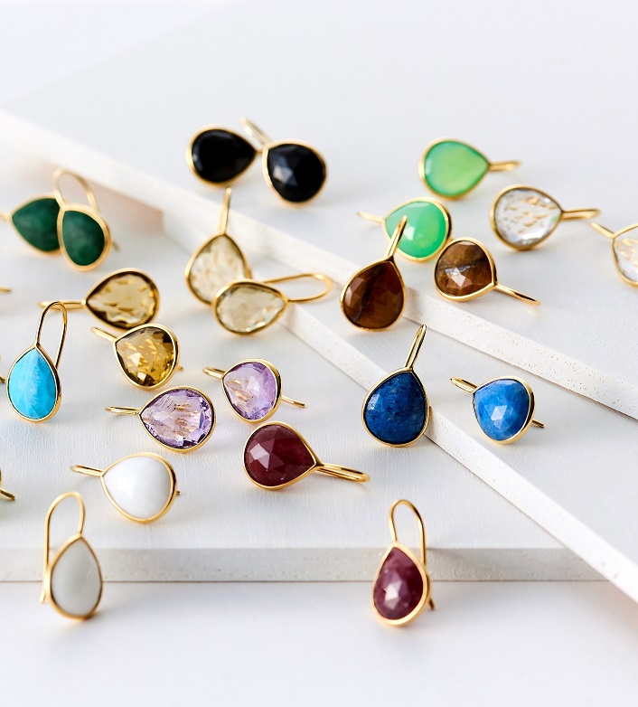 オリジナルカットを施した彩り豊かな天然石は、光を受けるたびに表情を変え、一粒一粒が異なる個性を放ちます。顔まわりに華やぎを添えながらも、日常に自然と溶け込むバランス感覚は〈ラ・スール〉ならではです。