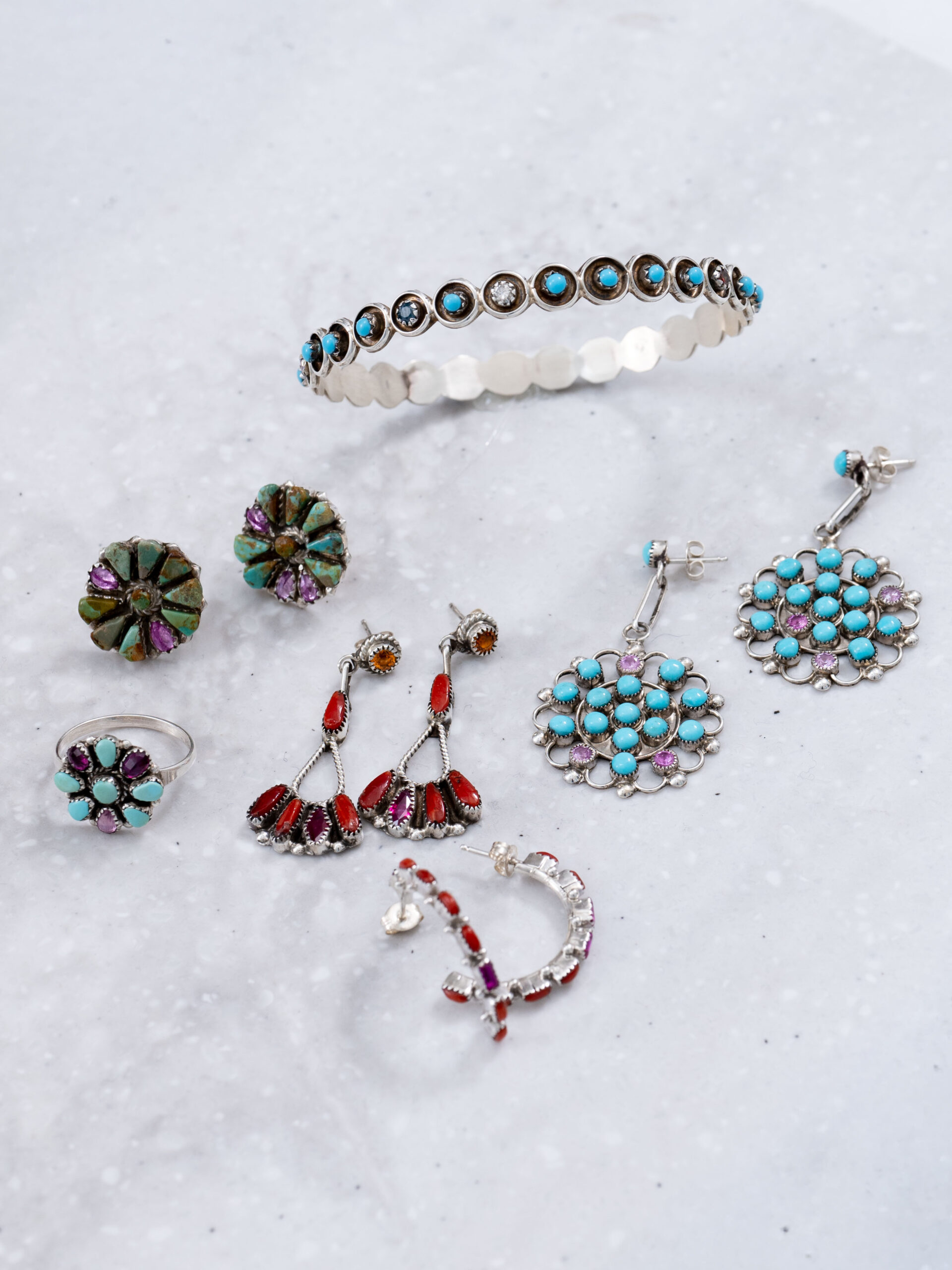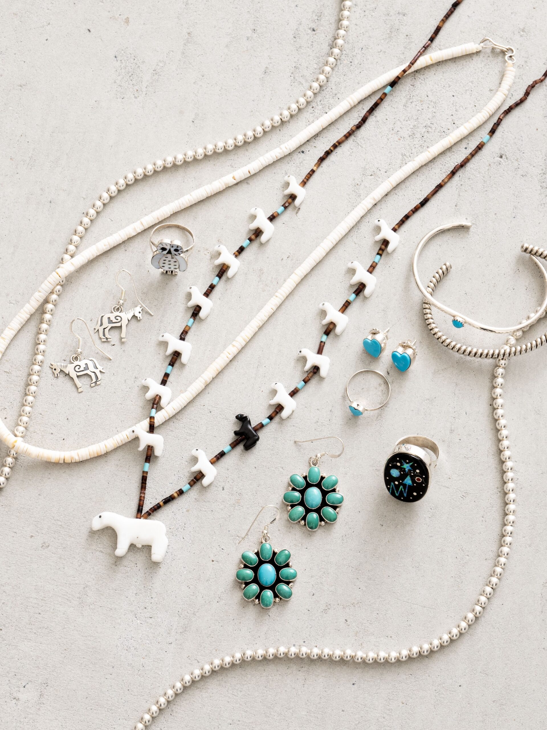 本イベントのために買い付けたターコイズをはじめ、多彩な素材を用いたネックレス、ピアス、バングル、リングが揃い、装いに確かな存在感を添えます。