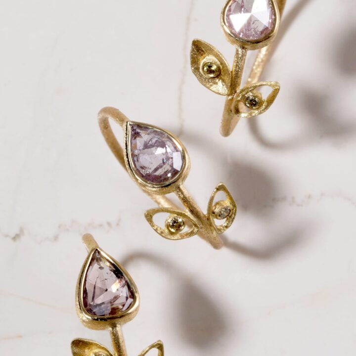 ニュアンスカラーをたたえたダイヤモンドを花のフォルムに象り、葉の部分にはみずみずしいグリーンダイヤモンドをセッティング。繊細な色のグラデーションと立体的な造形が調和し、可憐でありながら印象的な存在感を放ちます。