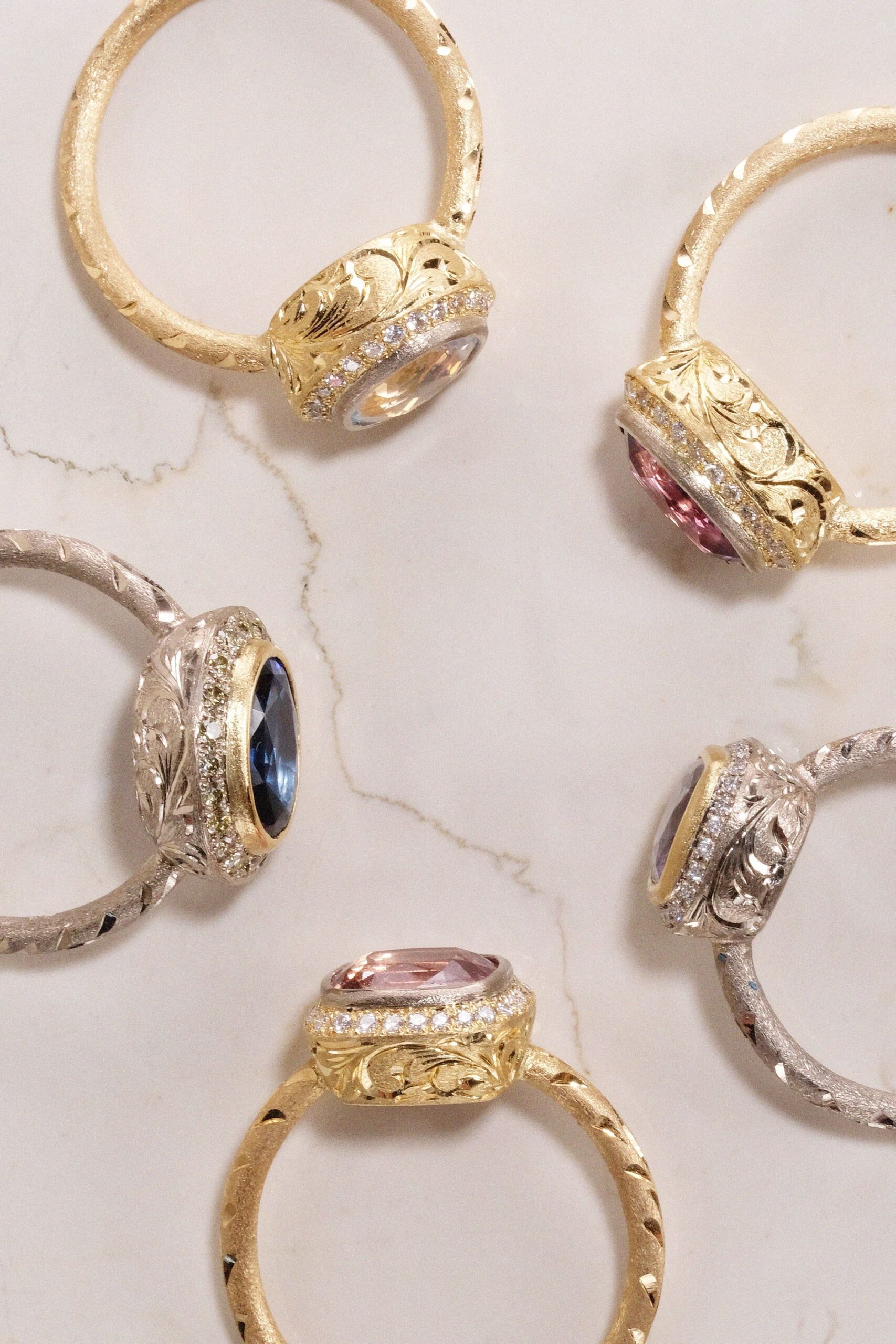 ブーケの名の通り、色とりどりのサファイアを束ねたデザインは、石そのものの透明感と発色を堪能できる一本。