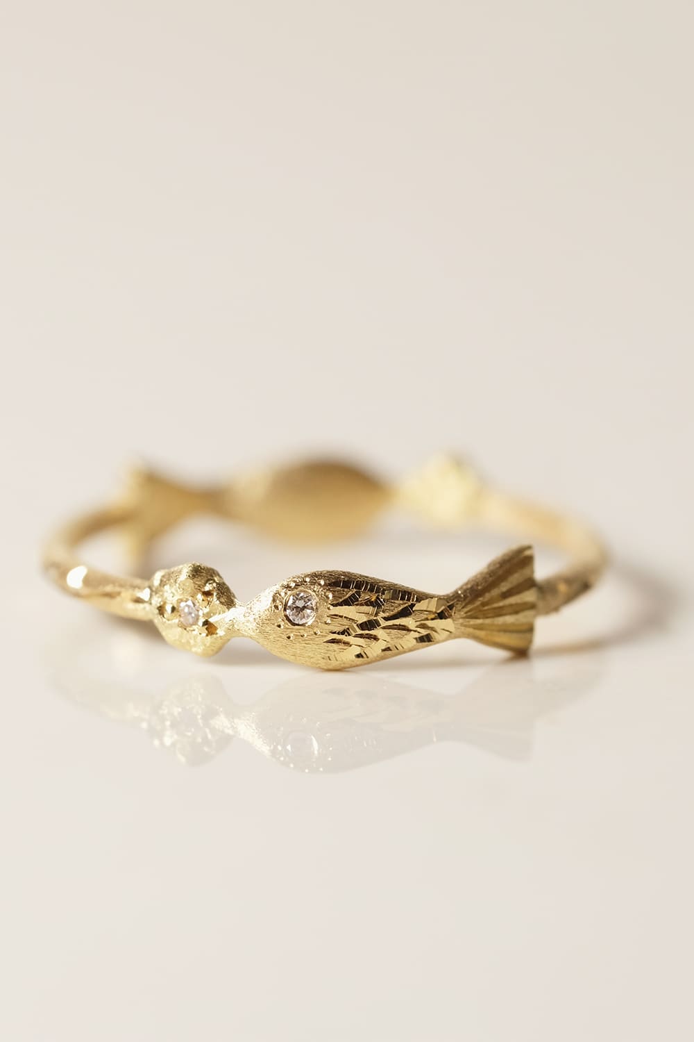 会場ではそのほかにも、様々な色合いが美しいスリランカ産サファイアを用いた「ブーケリング」や、前身ブランド「muska」時代からのロングセラー「フィッシュ」シリーズが登場。