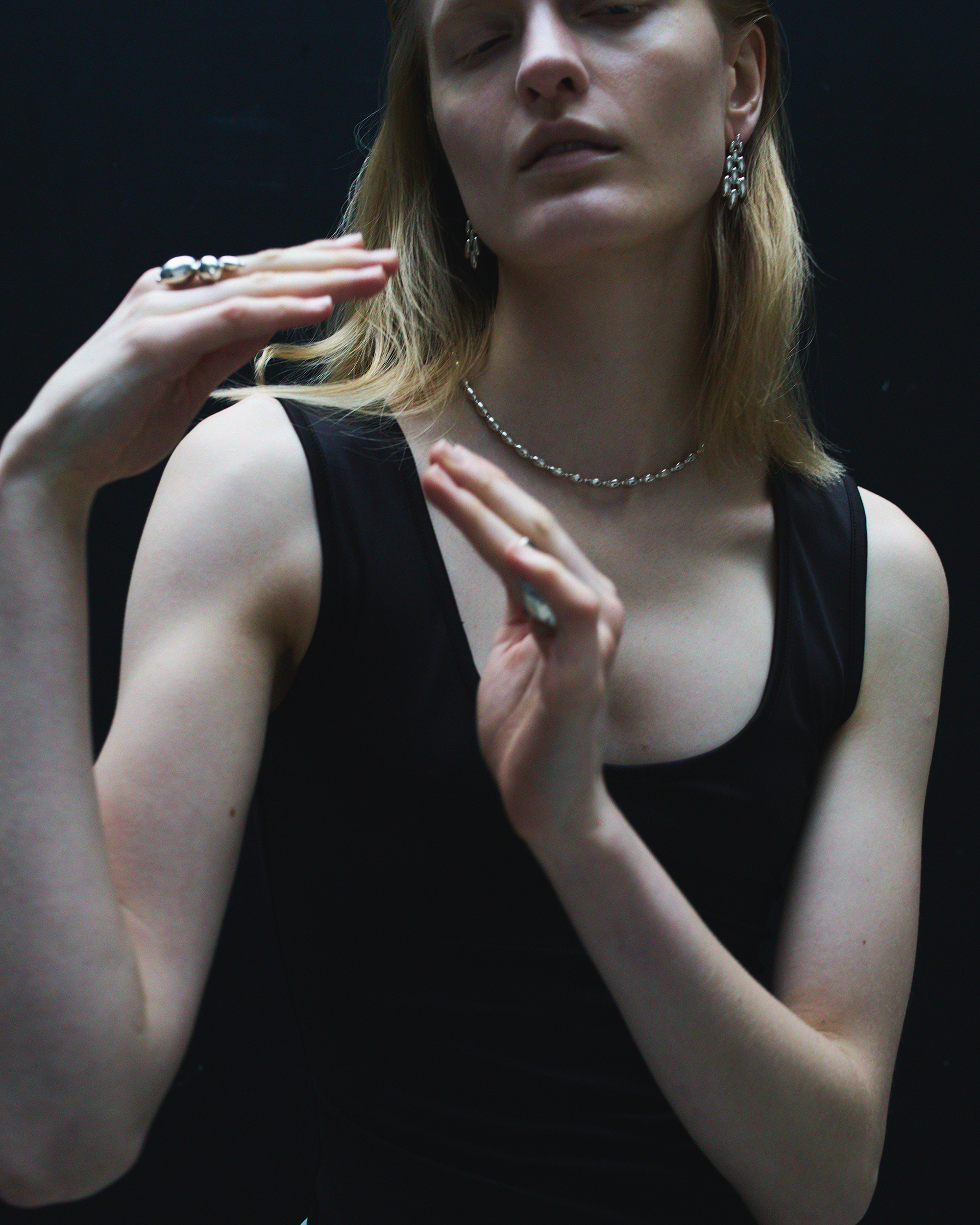 重ね付けやミックスアンドマッチを前提とした設計も特徴のひとつ。幾通りにもアレンジできるネックレスや、エキセントリックなシルエットのピアスなど、大胆さと知性をあわせ持つデザインが揃います。ジェンダーレスでフリースピリットが光る佇まいは、身につける人のユニークな一面を自然に引き出します。