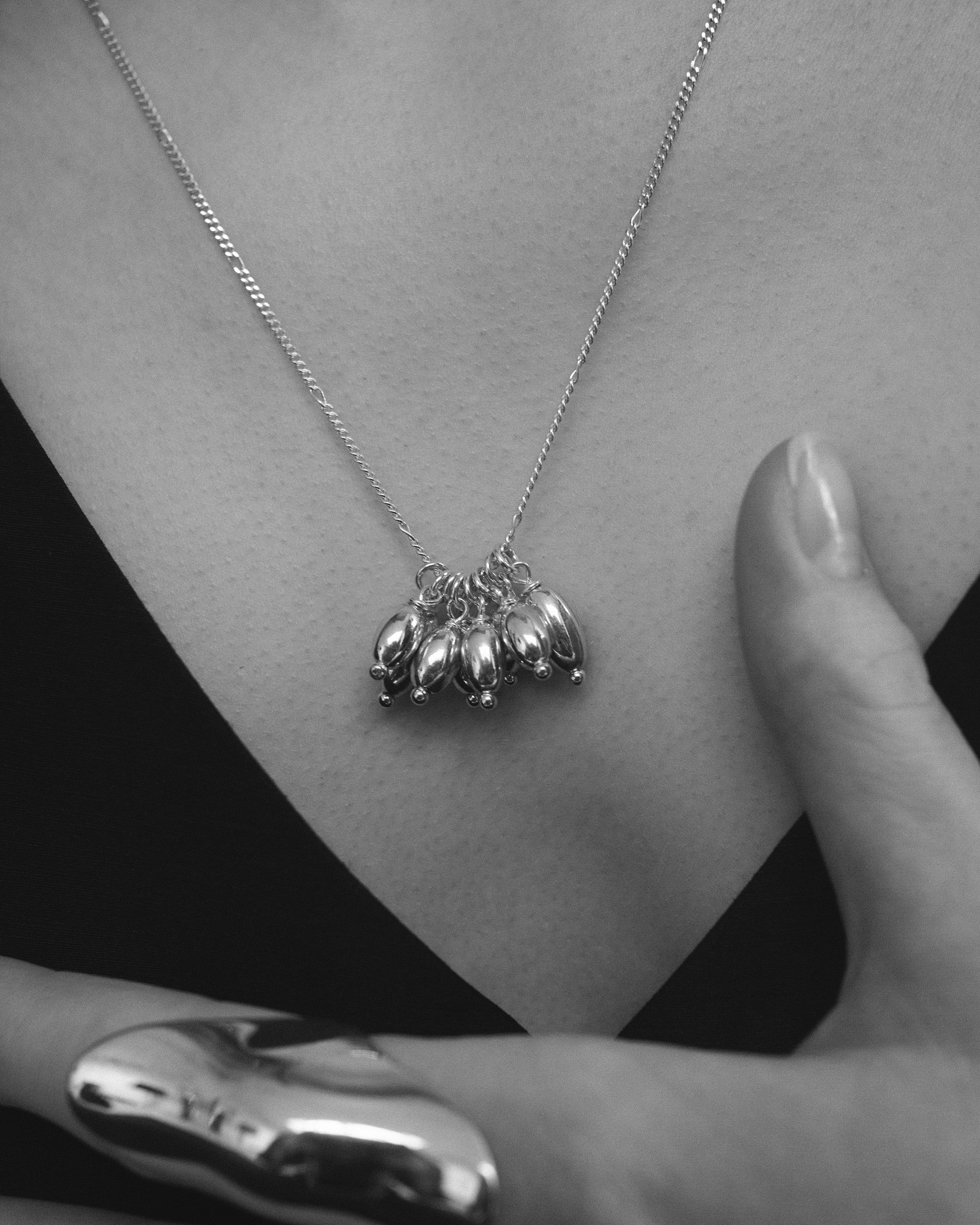 germe hang necklace | 種をイメージした有機的なフォルムが繊細なチェーンの上で軽やかに揺れ、首元にさりげない奥行きとリズムをプラス。後ろに回せばフロントはすっきりと、バックスタイルに静かな余韻を残します。