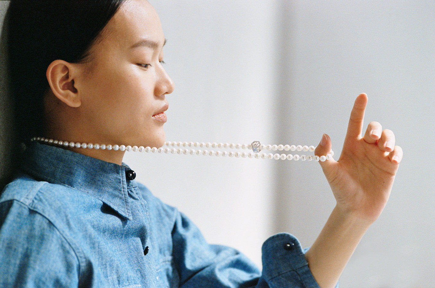 無調色・同色調で厳選されたアコヤ真珠を使用し、日本人の肌に馴染むやわらかな白が特徴。珠と珠の間に余白を持たせたネックレスは、鎖骨に沿ってしなやかに揺れ、Tシャツやデニムといったカジュアルスタイルにも軽やかにフィットします。