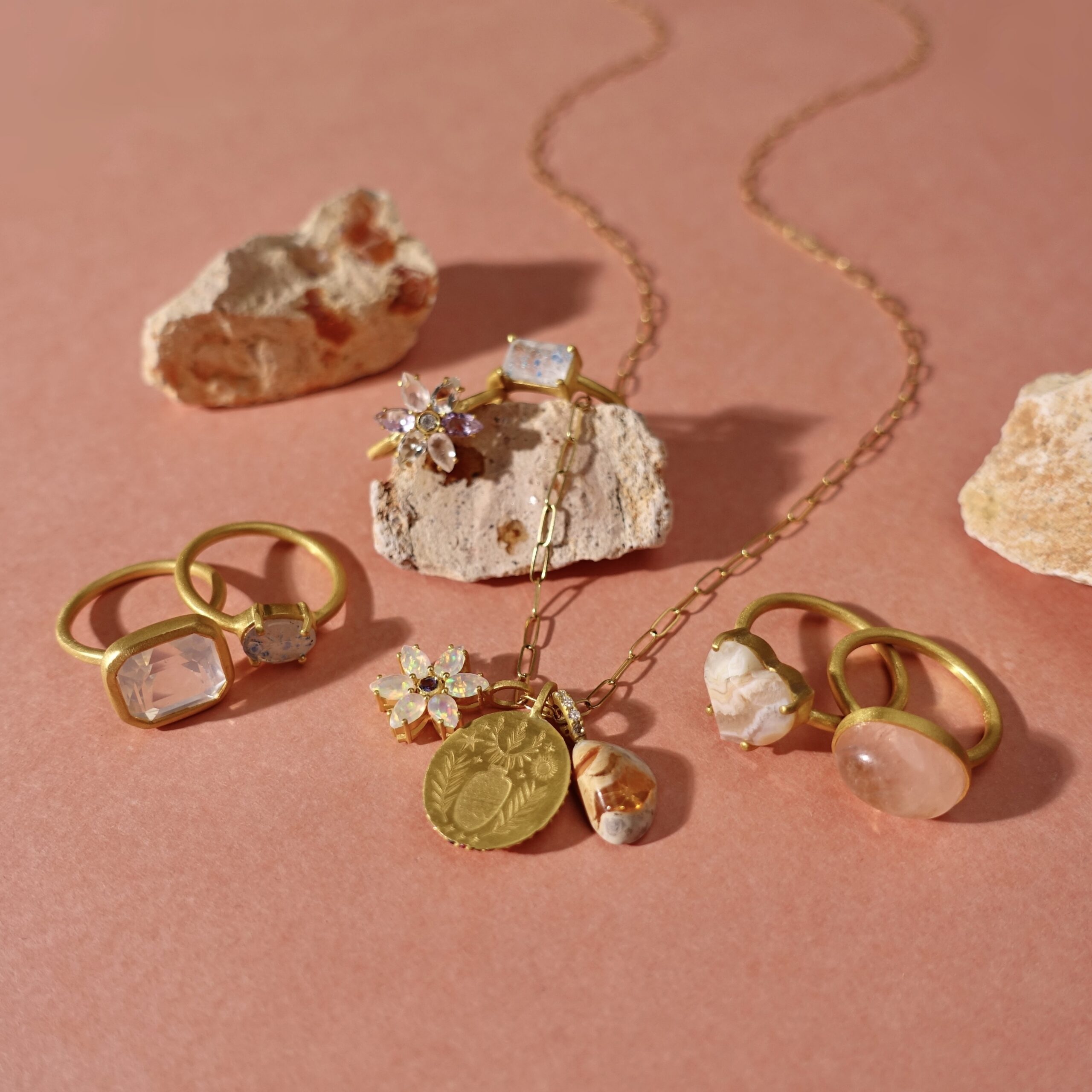 “アーバンリゾート”をコンセプトに、都会的なデザインでありながらも非日常に触れたときのような高揚感、心地よい開放感を届けるジュエリーブランド《Kui Co.(クイ)》。大切な人と訪れた思い出の景色や、いつか行きたい憧れの旅先、異国情緒あふれるマーケットなど、さまざまなインスピレーションをもとに、色鮮やかで表情豊かな天然素材を厳選し掛け合わせ、五感が刺激されるようなアイテムを展開しています。